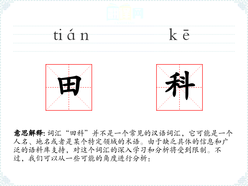 词汇“田科”并不是一个常见的汉语词汇,它可能是一个人名、地名或者是某个特定领域的术语。由于缺乏具体的信息和广泛的语料库支持,对这个词汇的深入学习和分析将受到限制。不过,我们可以从一些可能的角度进行分析: