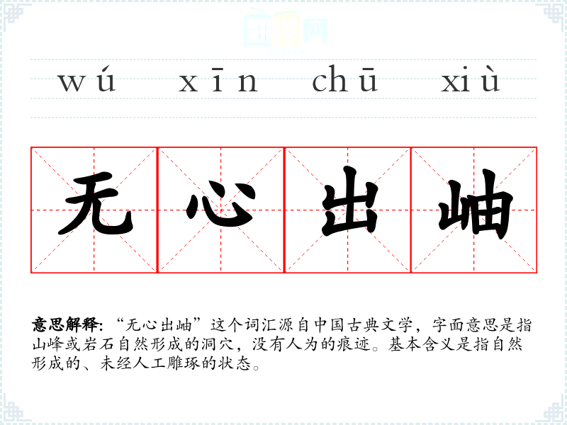 “无心出岫”这个词汇源自**古代文学,特别是在描述山水诗中常见。随着时间的推移,这个词汇的含义和用法基本保持稳定,主要用于强调自然美的原始和未经修饰的特质。