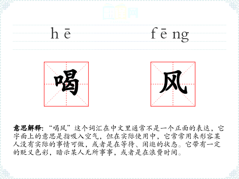 “喝风”这个词汇在中文里通常不是一个正面的表达,它字面上的意思是指吸入空气,但在实际使用中,它常常用来形容某人没有实际的事情可做,或者是在等待、闲逛的状态。它带有一定的贬义色彩,暗示某人无所事事,或者是在浪费时间。