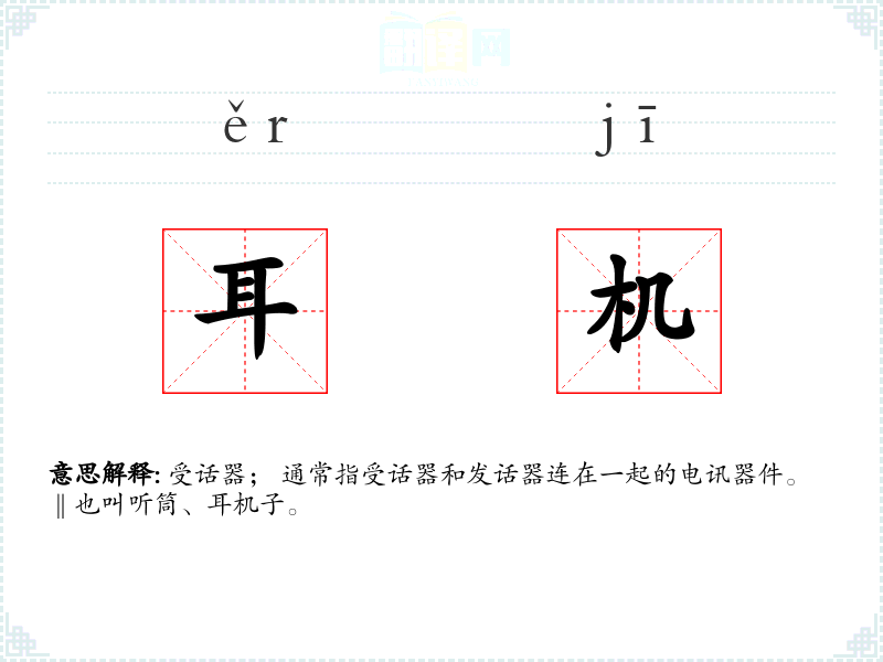 受话器; 通常指受话器和发话器连在一起的电讯器件。‖也叫听筒、耳机子。