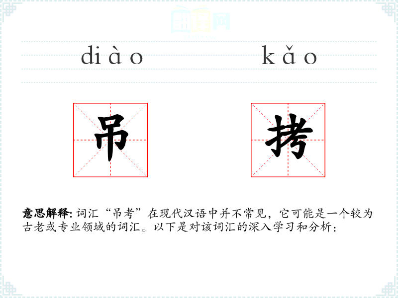 词汇“吊考”在现代汉语中并不常见,它可能是一个较为古老或专业领域的词汇。以下是对该词汇的深入学*和分析:
