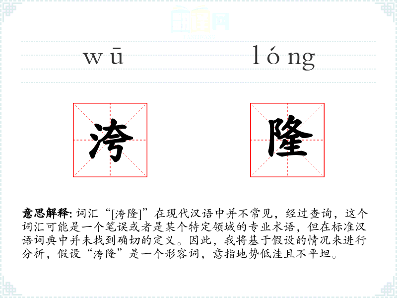 词汇“[洿隆]”在现代汉语中并不常见,经过查询,这个词汇可能是一个笔误或者是某个特定领域的专业术语,但在标准汉语词典中并未找到确切的定义。因此,我将基于假设的情况来进行分析,假设“洿隆”是一个形容词,意指地势低洼且不平坦。