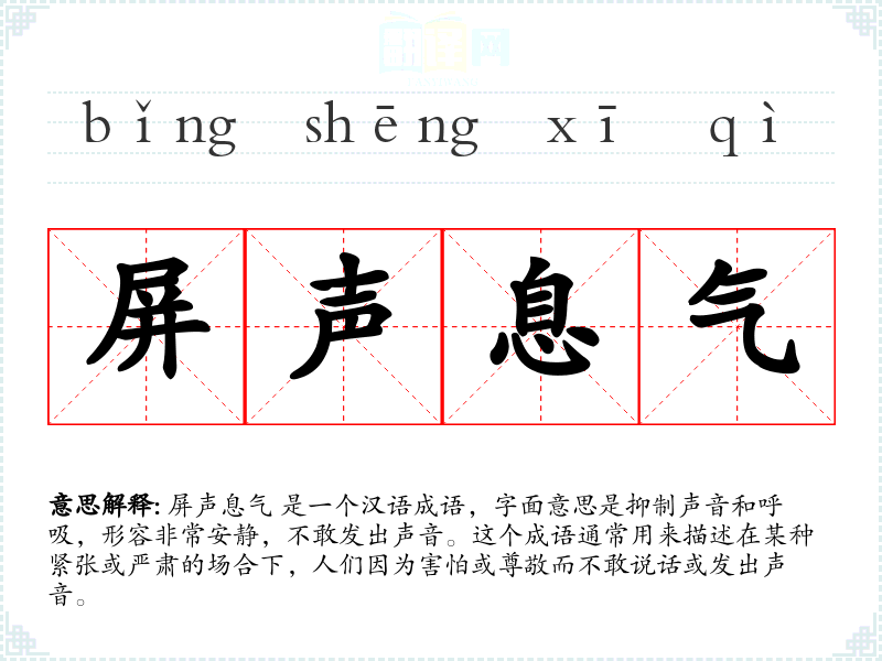 屏声息气 是一个汉语成语,字面意思是抑制声音和呼吸,形容非常安静,不敢发出声音。这个成语通常用来描述在某种紧张或严肃的场合下,人们因为害怕或尊敬而不敢说话或发出声音。