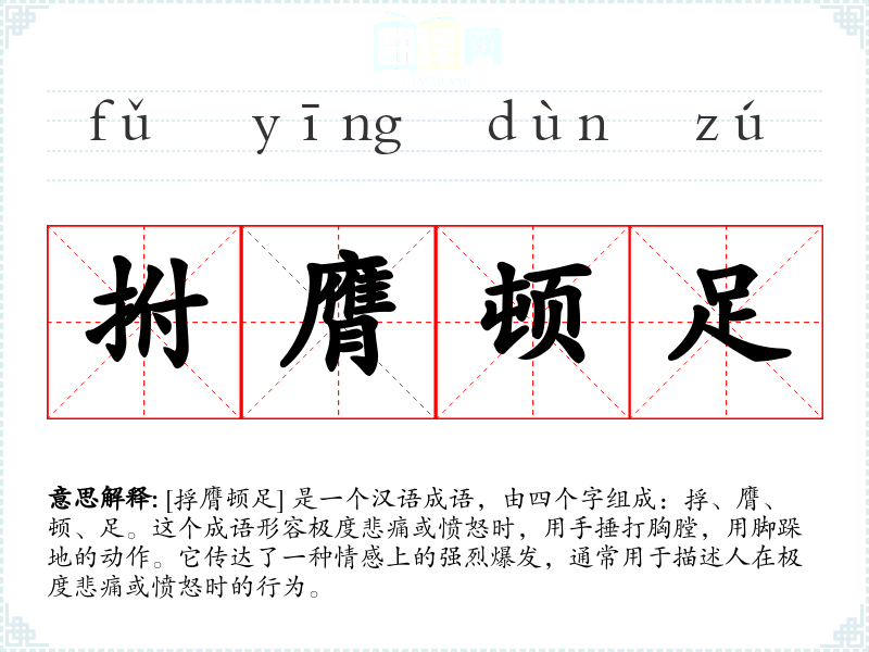 [捊膺顿足] 是一个富有表现力的成语,它不仅传达了强烈的情感,还反映了人类在面对极端情绪时的共同反应。在语言学*和表达中,理解和运用这样的成语可以增强语言的丰富性和表现力。