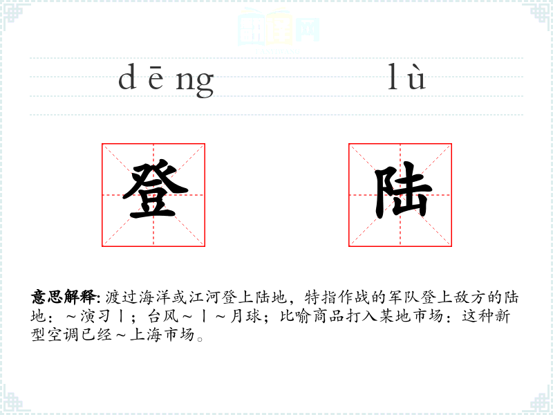 渡过海洋或江河登上陆地,特指作战的军队登上敌方的陆地:~演习丨;台风~丨~月球;比喻商品打入某地市场:这种新型空调已经~上海市场。