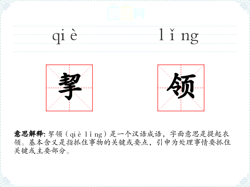 挈领(qiè lǐng)是一个汉语成语,字面意思是提起衣领。基本含义是指抓住事物的关键或要点,引申为处理事情要抓住关键或主要部分。