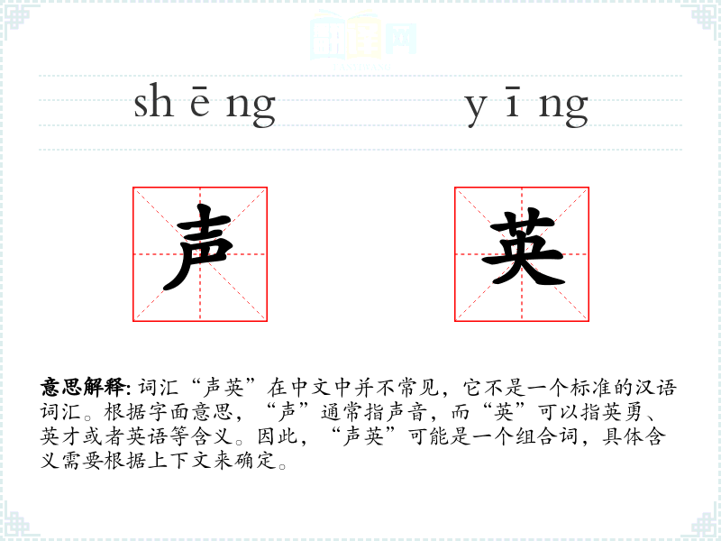 由于“声英”不是一个标准词汇,我们无法给出一个确切的基本定义。它可能是某个特定领域或方言中的词汇,或者是某个特定语境下的创造性用法。