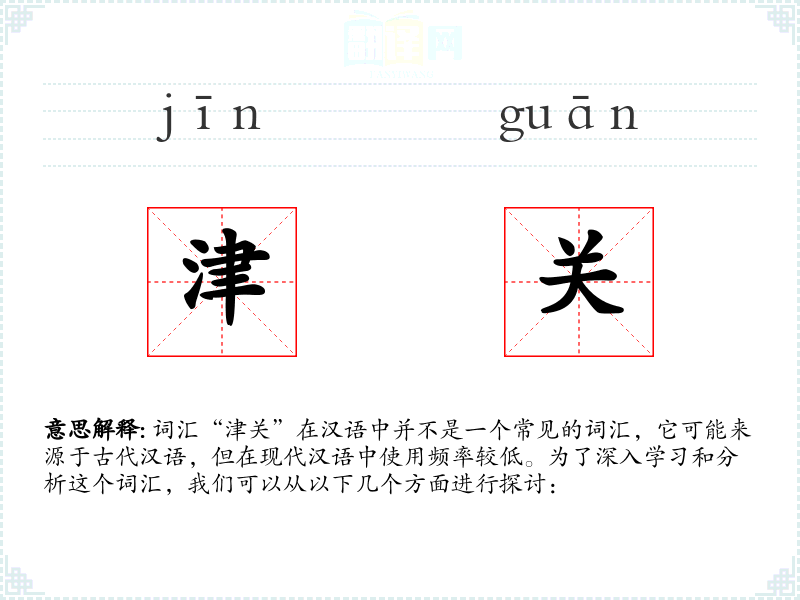 词汇“津关”在汉语中并不是一个常见的词汇,它可能来源于古代汉语,但在现代汉语中使用频率较低。为了深入学*和分析这个词汇,我们可以从以下几个方面进行探讨: