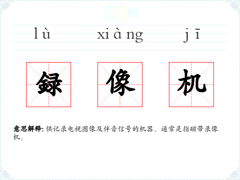 供记录电视图像及伴音信号的机器。通常是指磁带录像机。