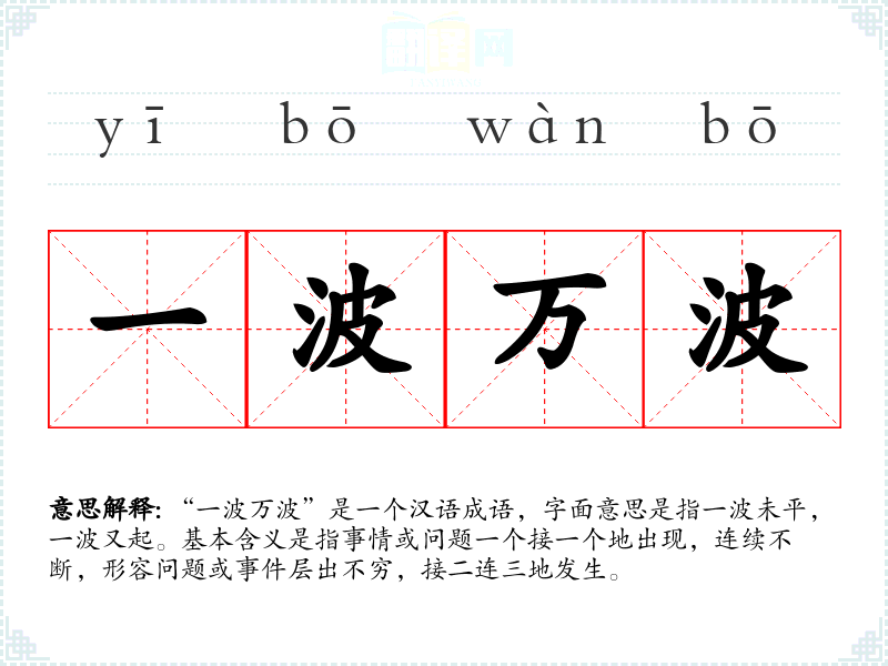 “一波万波”是一个汉语成语,字面意思是指一波未平,一波又起。基本含义是指事情或问题一个接一个地出现,连续不断,形容问题或**层出不穷,接二连三地发生。