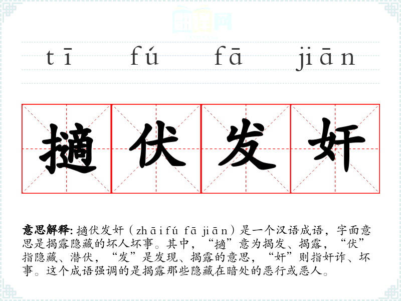 擿伏发奸(zhāi fú fā jiān)是一个汉语成语,字面意思是揭露隐藏的坏人坏事。其中,“擿”意为揭发、揭露,“伏”指隐藏、潜伏,“发”是发现、揭露的意思,“奸”则指奸诈、坏事。这个成语强调的是揭露那些隐藏在暗处的恶行或恶人。