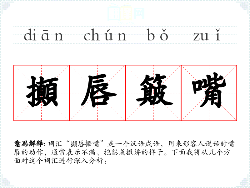 词汇“攧唇撅嘴”是一个汉语成语,用来形容人说话时嘴唇的动作,通常表示不满、抱怨或撒娇的样子。下面我将从几个方面对这个词汇进行深入分析:
