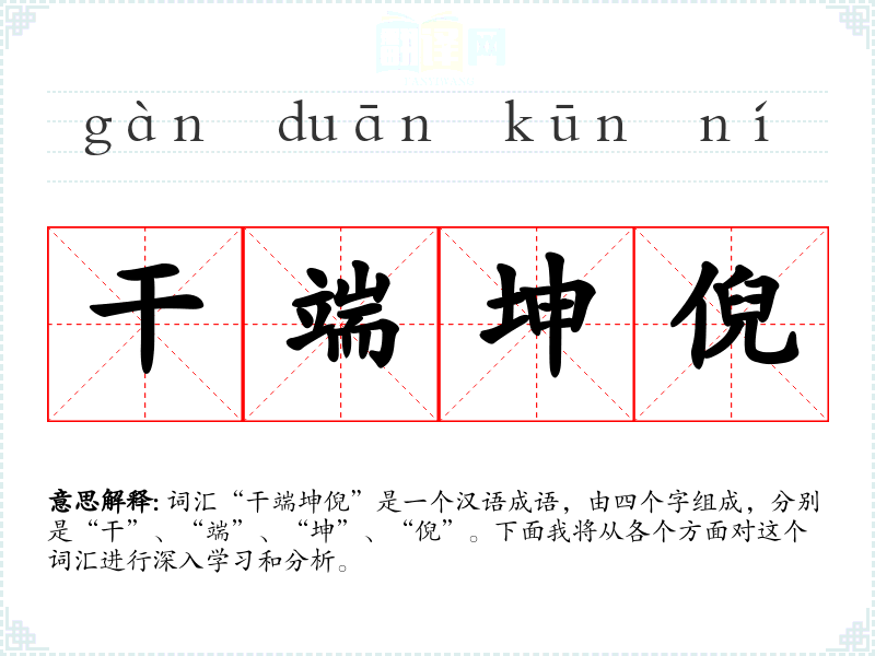 词汇“干端坤倪”是一个汉语成语,由四个字组成,分别是“干”、“端”、“坤”、“倪”。下面我将从各个方面对这个词汇进行深入学*和分析。