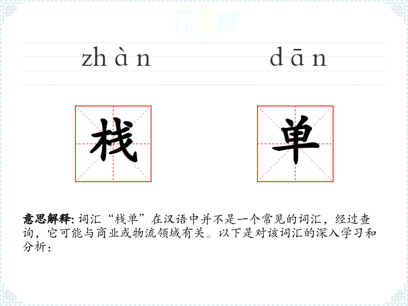 词汇“栈单”在汉语中并不是一个常见的词汇,经过查询,它可能与商业或物流领域有关。以下是对该词汇的深入学习和分析: