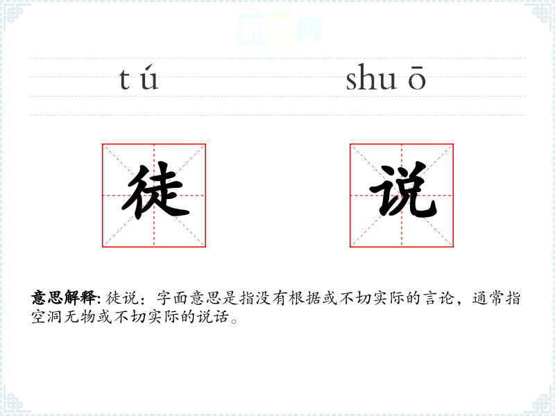 徒说:字面意思是指没有根据或不切实际的言论,通常指空洞无物或不切实际的说话。
