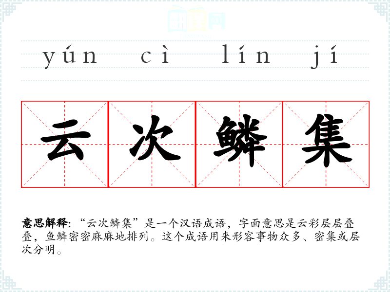 “云次鳞集”是一个汉语成语,字面意思是云彩层层叠叠,鱼鳞密密麻麻地排列。这个成语用来形容事物众多、密集或层次分明。