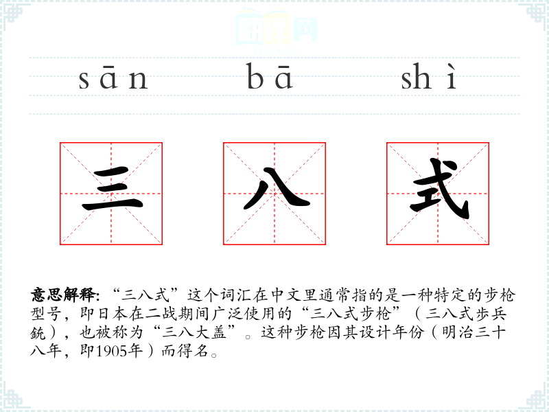 "三八式"的意思解释、三八式是什么意思由翻译网汉语词典查词提供。