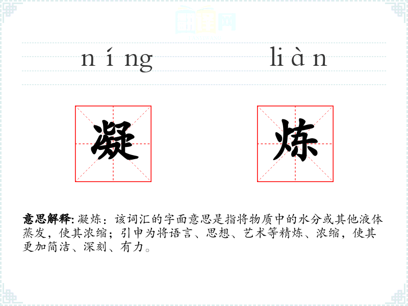 凝炼:该词汇的字面意思是指将物质中的水分或其他液体蒸发,使其浓缩;引申为将语言、思想、艺术等精炼、浓缩,使其更加简洁、深刻、有力。