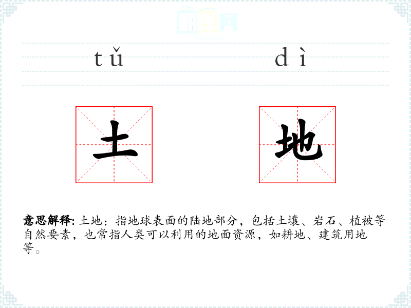 土地:指地球表面的陆地部分,包括土壤、岩石、植被等自然要素,也常指人类可以利用的地面资源,如耕地、建筑用地等。