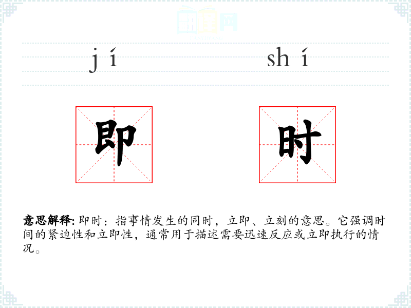 即时:指事情发生的同时,立即、立刻的意思。它强调时间的紧迫性和立即性,通常用于描述需要迅速反应或立即执行的情况。