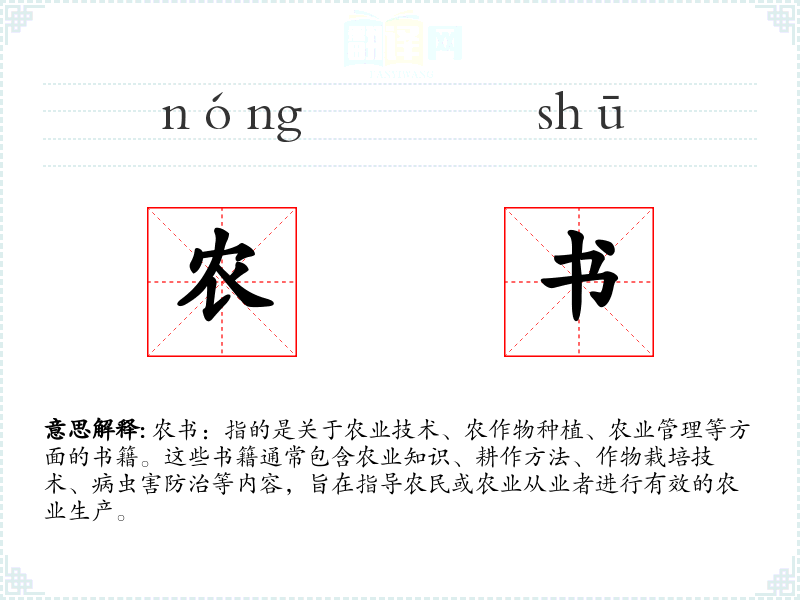 - 口语:在日常对话中,农书可能被提及作为农业知识的来源或农业教育的工具。