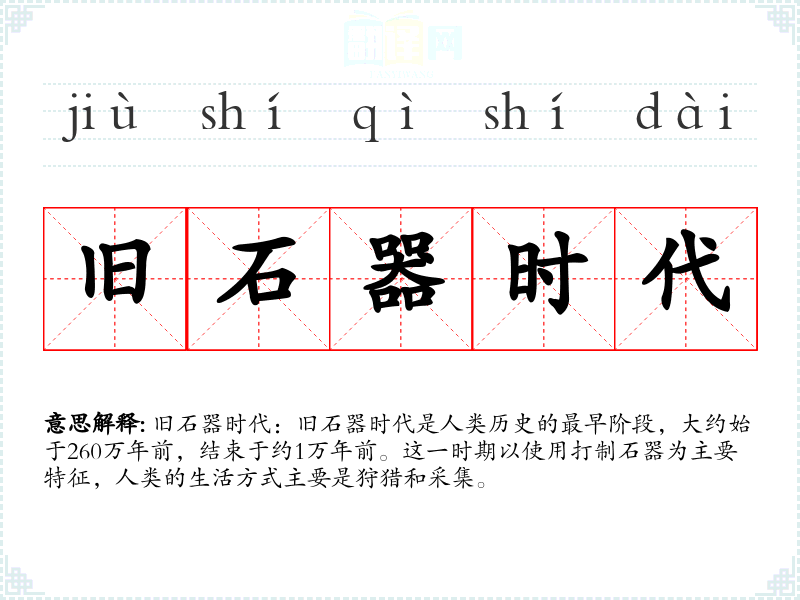 旧石器时代:旧石器时代是人类历史的最早阶段,大约始于2*0万年前,结束于约1万年前。这一时期以使用打制石器为主要特征,人类的生活方式主要是狩猎和采集。