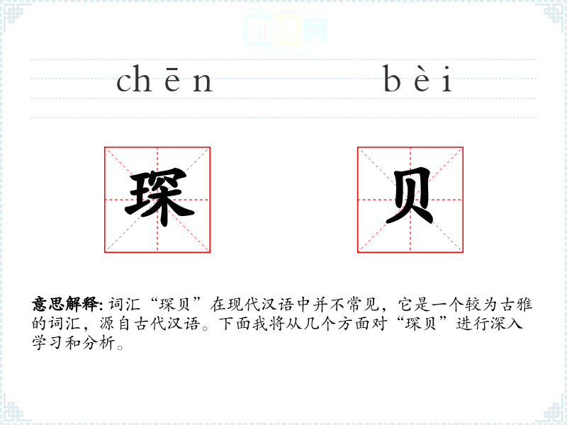 “琛贝”是一个充满历史和文化色彩的词汇,虽然在现代汉语中使用不多,但它能够丰富语言的表达,增添古典和文雅的氛围。在学*语言和表达时,了解和运用这样的词汇可以提升语言的深度和广度。