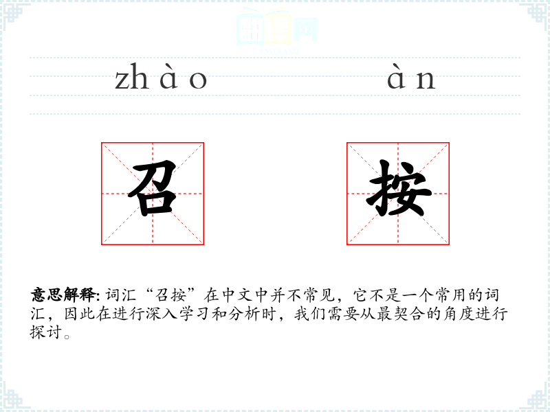 “召按”这个词汇的字面意思和基本含义并不明确,因为它不是一个标准的现代汉语词汇。在古代汉语中,“召”通常指召唤、召集,而“按”可以指按压、按照等。但将这两个字组合在一起,其具体含义需要结合具体语境来理解。