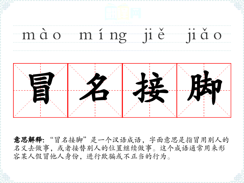 “冒名接脚”是一个汉语成语,字面意思是指冒用别人的名义去做事,或者接替别人的位置继续做事。这个成语通常用来形容某人假冒他人身份,进行欺骗或不正当的行为。