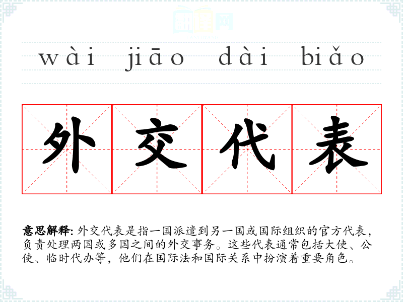 在不同语言和文化中,“外交代表”的对应词汇可能有所不同,但其核心含义和职责是相似的。例如,在法语中,这个词汇可能是“représentant diplomatique”。