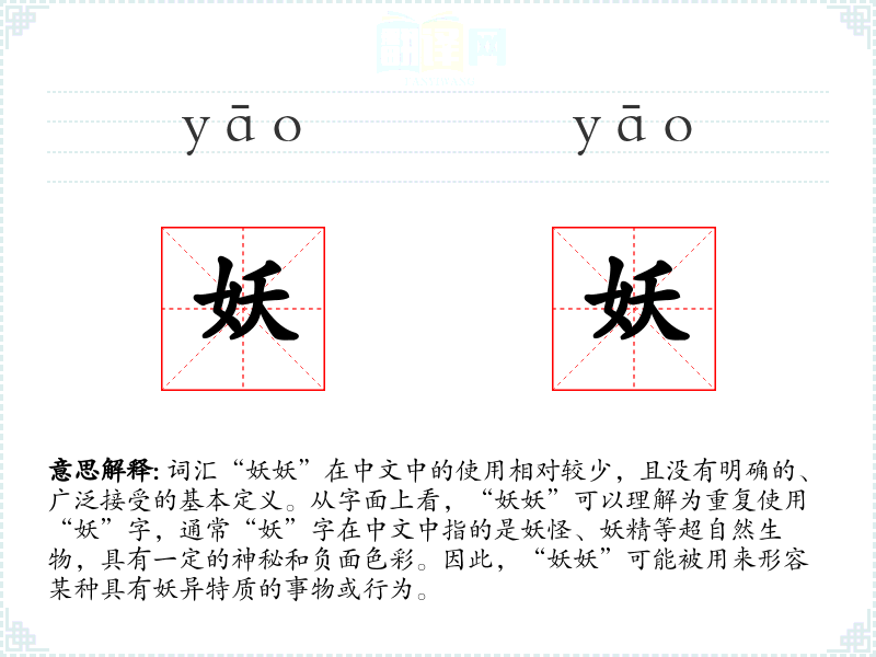 词汇“妖妖”在中文中的使用相对较少,且没有明确的、广泛接受的基本定义。从字面上看,“妖妖”可以理解为重复使用“妖”字,通常“妖”字在中文中指的是妖怪、妖精等超自然生物,具有一定的神秘和负面色彩。因此,“妖妖”可能被用来形容某种具有妖异特质的事物或行为。