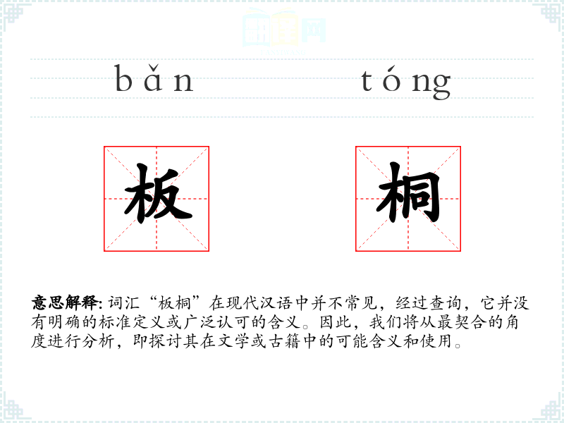 词汇“板桐”在现代汉语中并不常见,经过查询,它并没有明确的标准定义或广泛认可的含义。因此,我们将从最契合的角度进行分析,即探讨其在文学或古籍中的可能含义和使用。