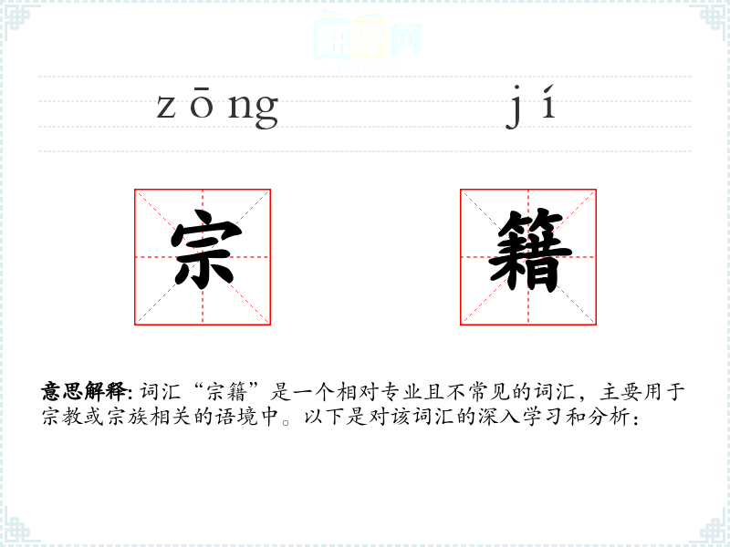 词汇“宗籍”是一个相对专业且不常见的词汇,主要用于*或宗族相关的语境中。以下是对该词汇的深入学和分析: