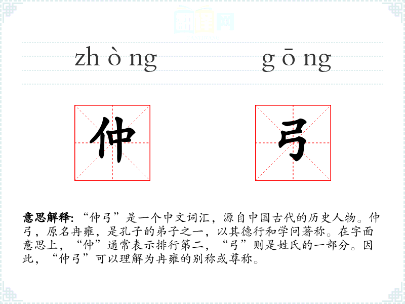 “仲弓”是一个中文词汇,源自**古代的历史人物。仲弓,原名冉雍,是孔子的弟子之一,以其德行和学问著称。在字面意思上,“仲”通常表示排行第二,“弓”则是姓氏的一部分。因此,“仲弓”可以理解为冉雍的别称或尊称。
