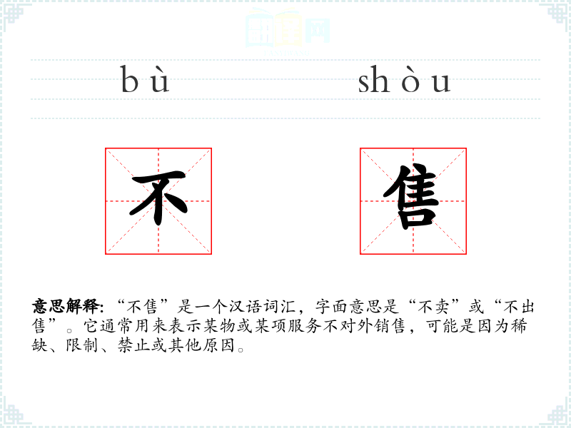 “不售”是一个汉语词汇,字面意思是“不卖”或“不出售”。它通常用来表示某物或某项服务不对外销售,可能是因为稀缺、限制、禁止或其他原因。