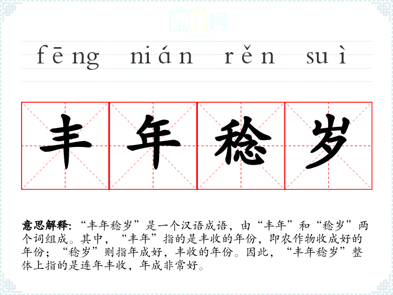 在中国文化中,农业一直被视为国家的基础,因此“丰年稔岁”不仅代表了物质上的富足,也象征着国家的稳定和人民的幸福。在传统节日如春节,人们常用这个成语来表达对未来一年的美好祝愿。