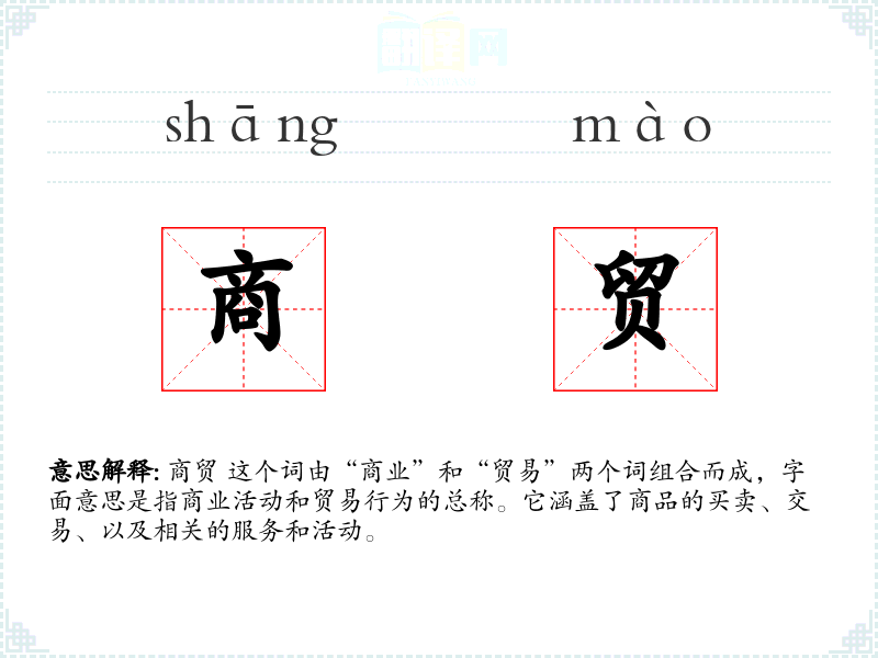 商贸 这个词由“商业”和“贸易”两个词组合而成,字面意思是指商业活动和贸易行为的总称。它涵盖了商品的买卖、交易、以及相关的服务和活动。