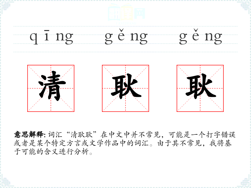 由于“清耿耿”不是一个标准词汇,其在不同语言或文化中的对应词汇难以比较。