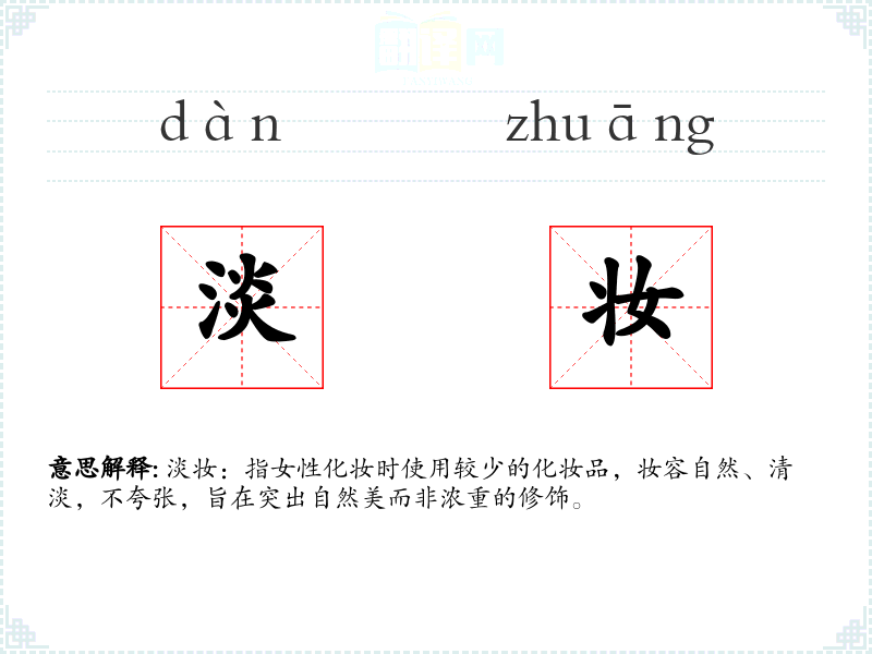 淡妆:指女性化妆时使用较少的化妆品,妆容自然、清淡,不夸张,旨在突出自然美而非浓重的修饰。