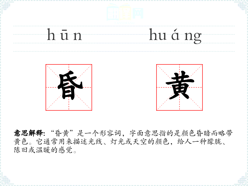 “昏黄”是一个富有情感色彩的词汇,它不仅描述了一种特定的色调,还承载了怀旧和回忆的情感。在语言学*和表达中,理解和运用“昏黄”能够丰富我们的词汇选择,增强表达的细腻度和情感深度。