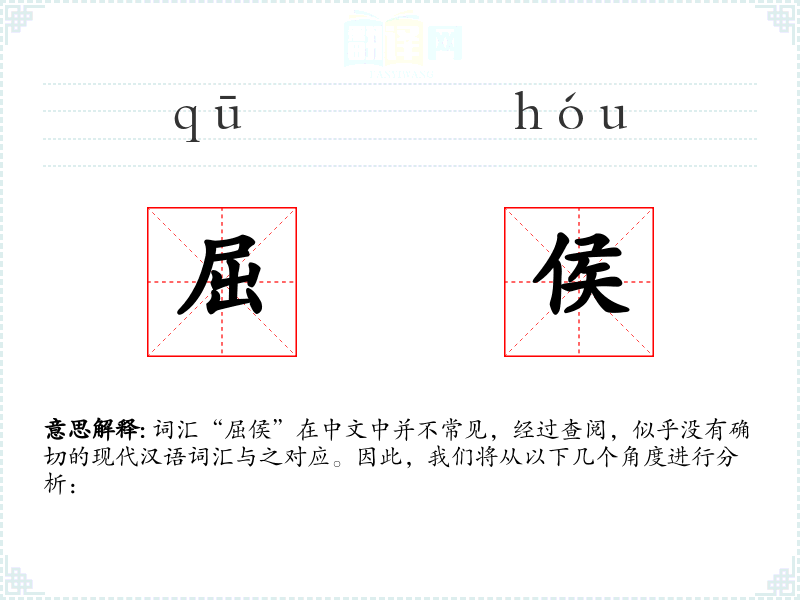 词汇“屈侯”在中文中并不常见,经过查阅,似乎没有确切的现代汉语词汇与之对应。因此,我们将从以下几个角度进行分析: