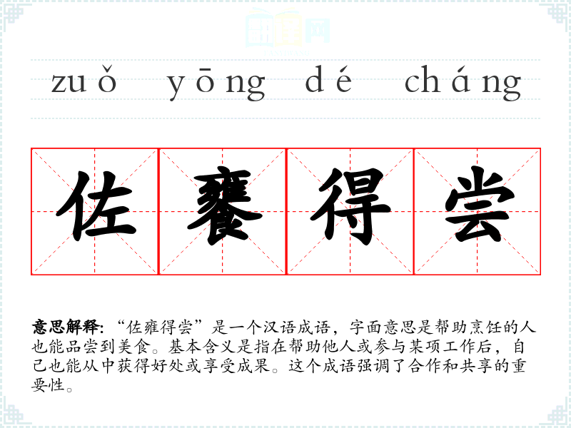 “佐雍得尝”是一个汉语成语,字面意思是帮助烹饪的人也能品尝到美食。基本含义是指在帮助他人或参与某项工作后,自己也能从中获得好处或享受成果。这个成语强调了合作和共享的重要性。