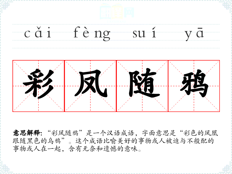 在中国传统文化中,凤凰象征着吉祥和美好,而乌鸦则常常被视为不吉利的象征。因此,“彩凤随鸦”这个成语在文化上强调了不匹配和遗憾的情感。