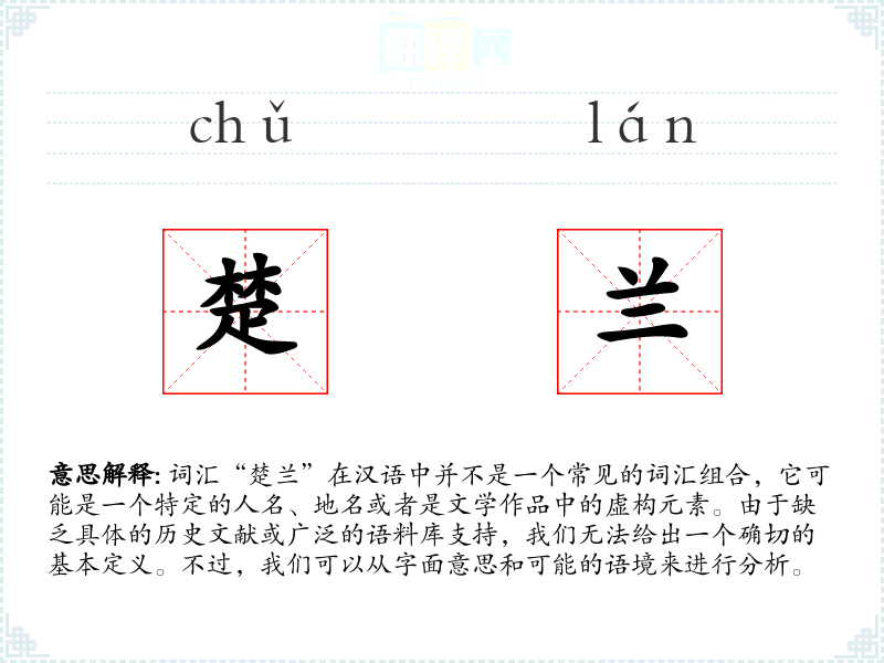 词源与演变: 由于“楚兰”不是一个常用词汇,其词源和演变难以追溯。它可能是由“楚”和“兰”两个字组合而成的,用以表达特定的文化或文学意义。