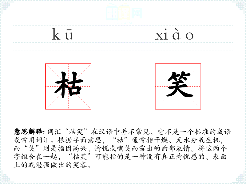 由于“枯笑”不是一个常用词汇,其词源和演变不详。它可能是由“枯”和“笑”两个字组合而成,用以表达一种特定的情感状态。
