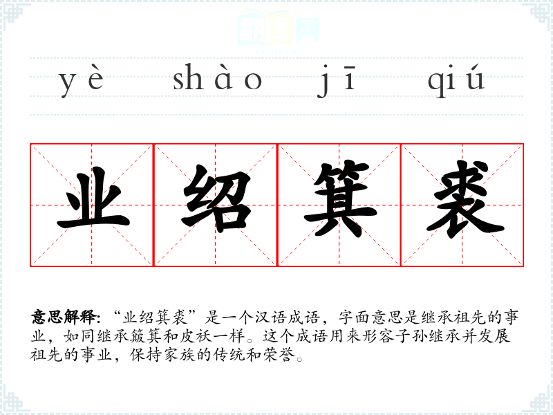 “业绍箕裘”是一个汉语成语,字面意思是继承祖先的事业,如同继承簸箕和皮袄一样。这个成语用来形容子孙继承并发展祖先的事业,保持家族的传统和荣誉。