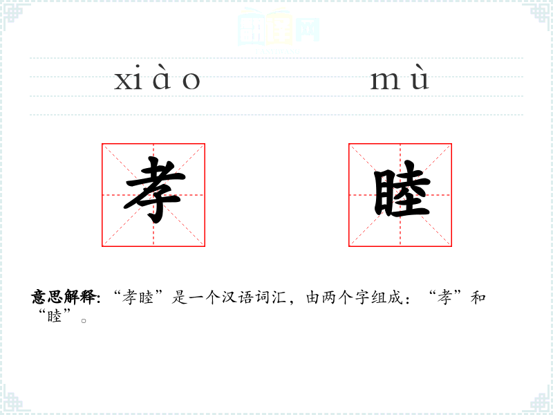 - 孝:指的是子女对父母的尊敬、顺从和照顾,是中国传统文化中非常重要的道德准则之一。