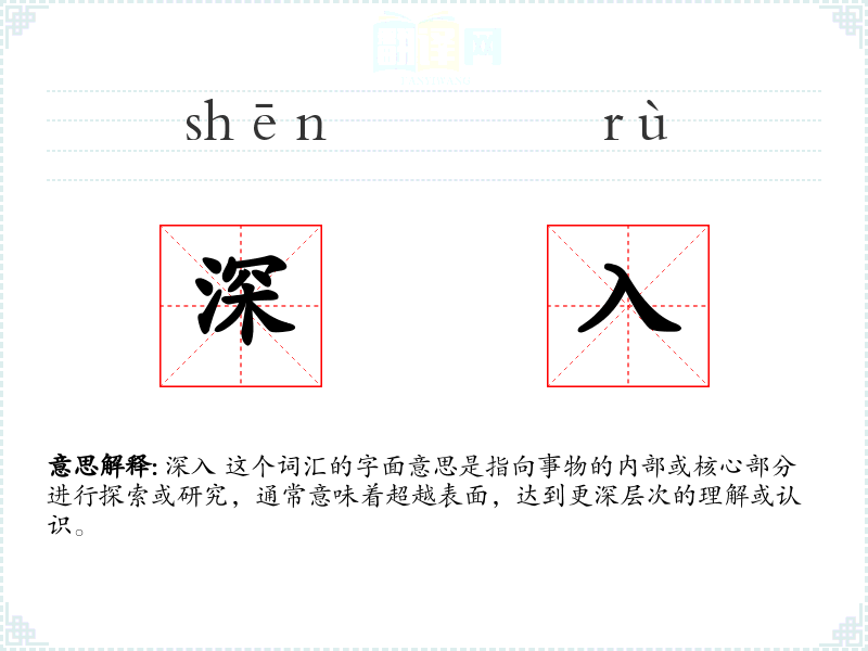 深入 这个词汇的字面意思是指向事物的内部或核心部分进行探索或研究,通常意味着超越表面,达到更深层次的理解或认识。