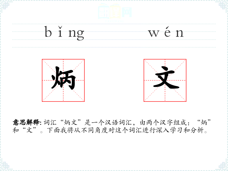 词汇“炳文”是一个汉语词汇,由两个汉字组成:“炳”和“文”。下面我将从不同角度对这个词汇进行深入学*和分析。