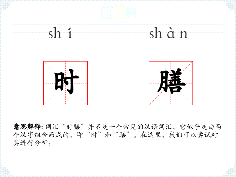 词汇“时膳”并不是一个常见的汉语词汇,它似乎是由两个汉字组合而成的,即“时”和“膳”。在这里,我们可以尝试对其进行分析: